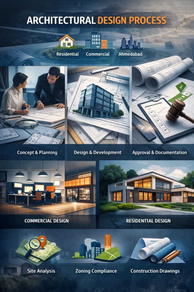 Commercial architectural design Ahmedabad focuses on operational efficiency, branding, and customer flow. Residential architectural design Ahmedabad prioritizes comfort, privacy, and personalization. Both require compliance and detailed planning, but commercial projects often involve stricter functional requirements.