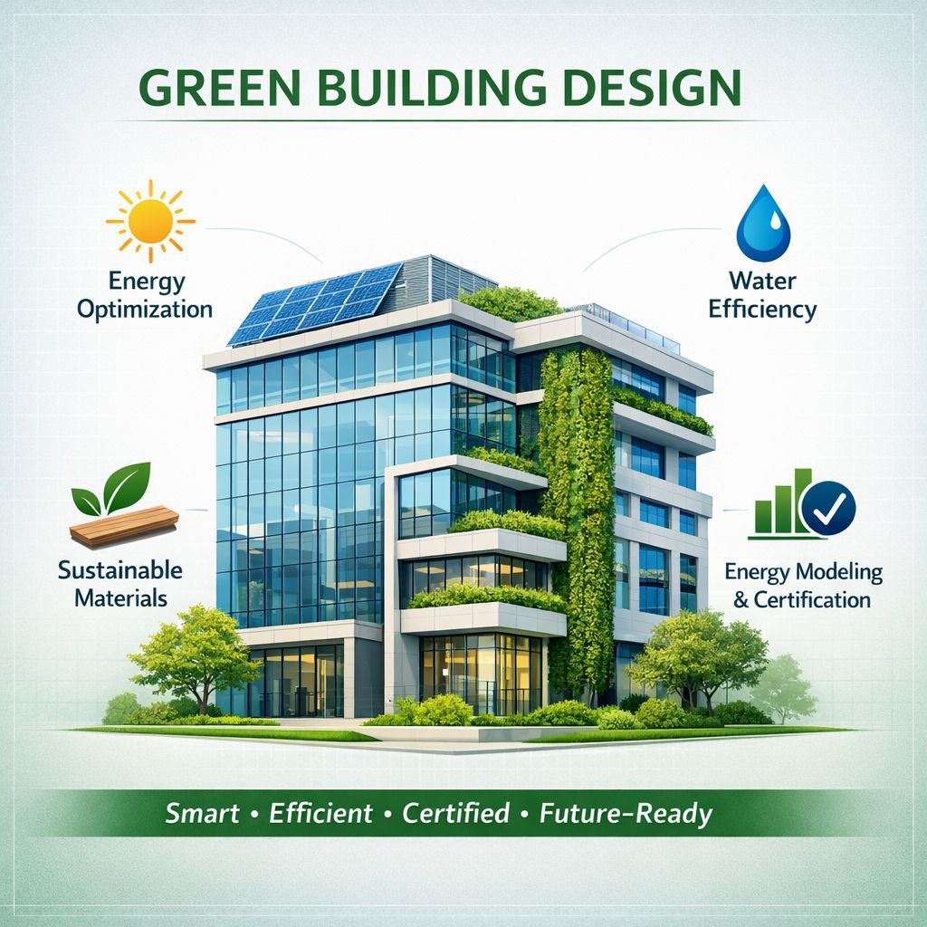 Sustainable construction is no longer optional; it is a strategic decision for long-term growth and operational efficiency. As a trusted Green building consultant in Ahmedabad, we provide practical and performance-driven solutions that reduce environmental impact while improving building value. Modern businesses and developers are increasingly choosing Green building design services Ahmedabad to lower energy costs, meet regulatory standards, and enhance brand reputation. Eco friendly building design Ahmedabad not only supports environmental responsibility but also improves indoor comfort and long-term savings. As a reliable Green architecture firm Ahmedabad, we focus on integrating sustainability from the early planning stage. Our Green building consultancy Ahmedabad services guide clients through energy efficiency strategies, material selection, and certification processes. With expertise in Energy modeling services Ahmedabad, we help optimize performance before construction begins. Aligning with Green building design services India standards ensures that projects meet national sustainability benchmarks. Our goal is to create buildings that are environmentally responsible, financially efficient, and built for the future.
