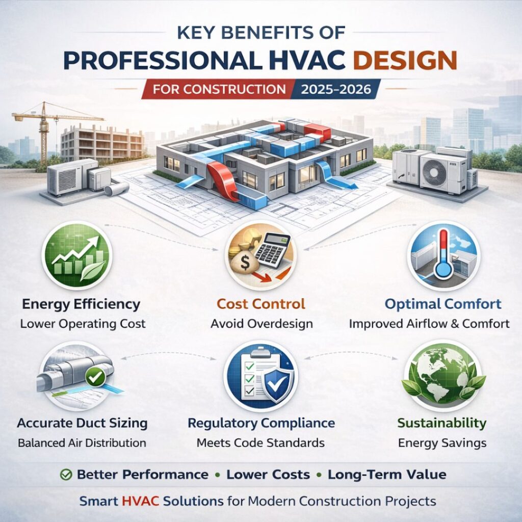 In 2025–2026, HVAC design for construction is a strategic component of building success. From HVAC duct design calculation to full-scale energy efficient HVAC design, every detail influences cost, comfort, and compliance.