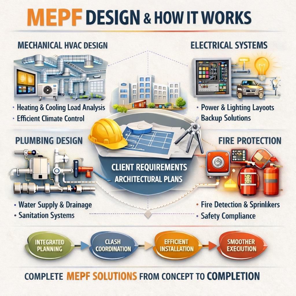 MEPF design refers to the planning and engineering of mechanical, electrical, plumbing, and fire protection systems within a building. The process begins when a client approaches an experienced MEPF consultant in Ahmedabad with architectural drawings and project requirements. First, heating and cooling loads are analyzed to develop efficient HVAC design services Ahmedabad that ensure indoor comfort and energy savings. Next, an electrical design consultant Ahmedabad plans power distribution, lighting systems, and backup solutions to ensure safe and uninterrupted operations. Plumbing design services Ahmedabad are then structured to provide water supply, drainage, and sanitation systems that meet safety standards. Fire fighting system design Ahmedabad integrates fire detection, sprinkler layouts, and safety compliance measures. Throughout the process, MEP consultancy services Ahmedabad coordinate all systems to avoid clashes and improve installation efficiency. By following this step-by-step approach, businesses receive coordinated engineering solutions that reduce confusion on site and support smoother project execution from concept to completion.