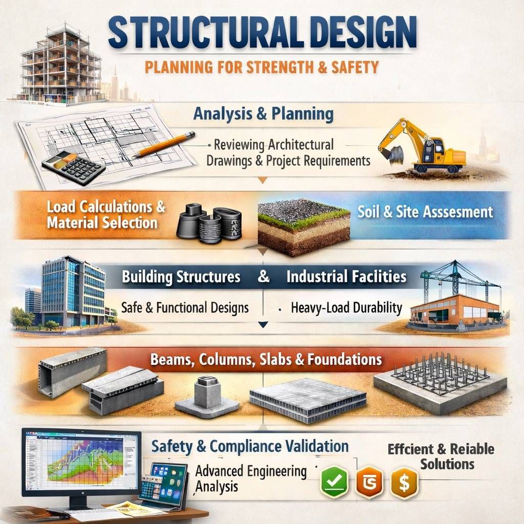 Strong structures are the foundation of every successful building project. As a trusted Structural design consultant in Ahmedabad, we provide reliable and code-compliant engineering solutions that ensure safety, durability, and long-term performance. Whether you are developing a commercial complex, residential tower, or industrial facility, professional Structural engineering services Ahmedabad help reduce construction risks and optimize material efficiency. In today’s competitive construction market, poorly planned structures can lead to safety issues, delays, and financial losses. A qualified Structural consultant Ahmedabad ensures that every building component is carefully analyzed before execution begins. Our expertise in Building structural design Ahmedabad focuses on strength, stability, and cost-effectiveness, helping businesses complete projects with confidence. From Industrial structural design Ahmedabad to multi-story commercial developments, we provide practical and performance-driven solutions. As a growing Structural design company in Ahmedabad with experience supporting Structural engineering services India, we combine technical knowledge with real-world site understanding to deliver structures that support business growth and long-term asset value.